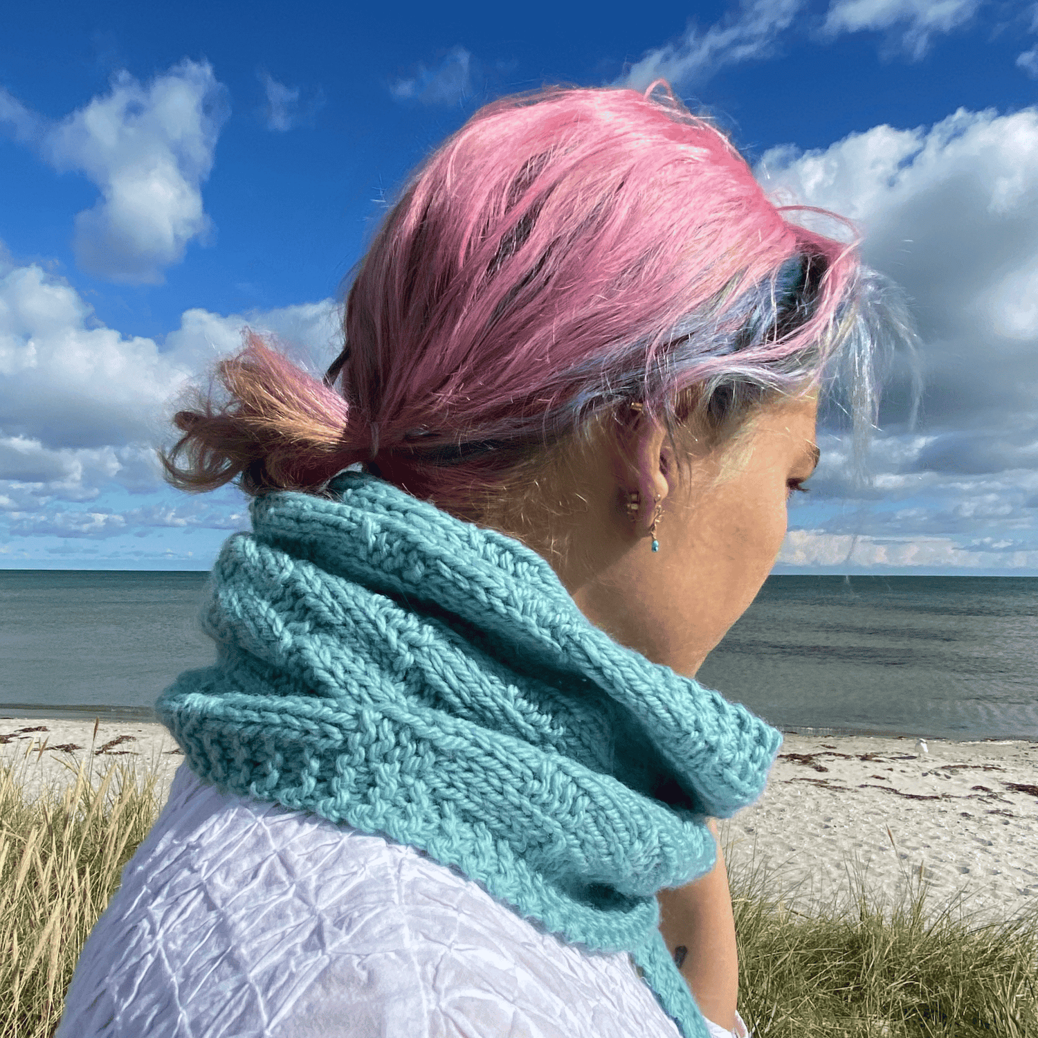 Download strikkeopskriften (PDF på dansk) til dette smukke tørklæde og strik dit eget Østersø halstørklæde. Enkelt mønster og hurtigt at strikke på tykke pinde.